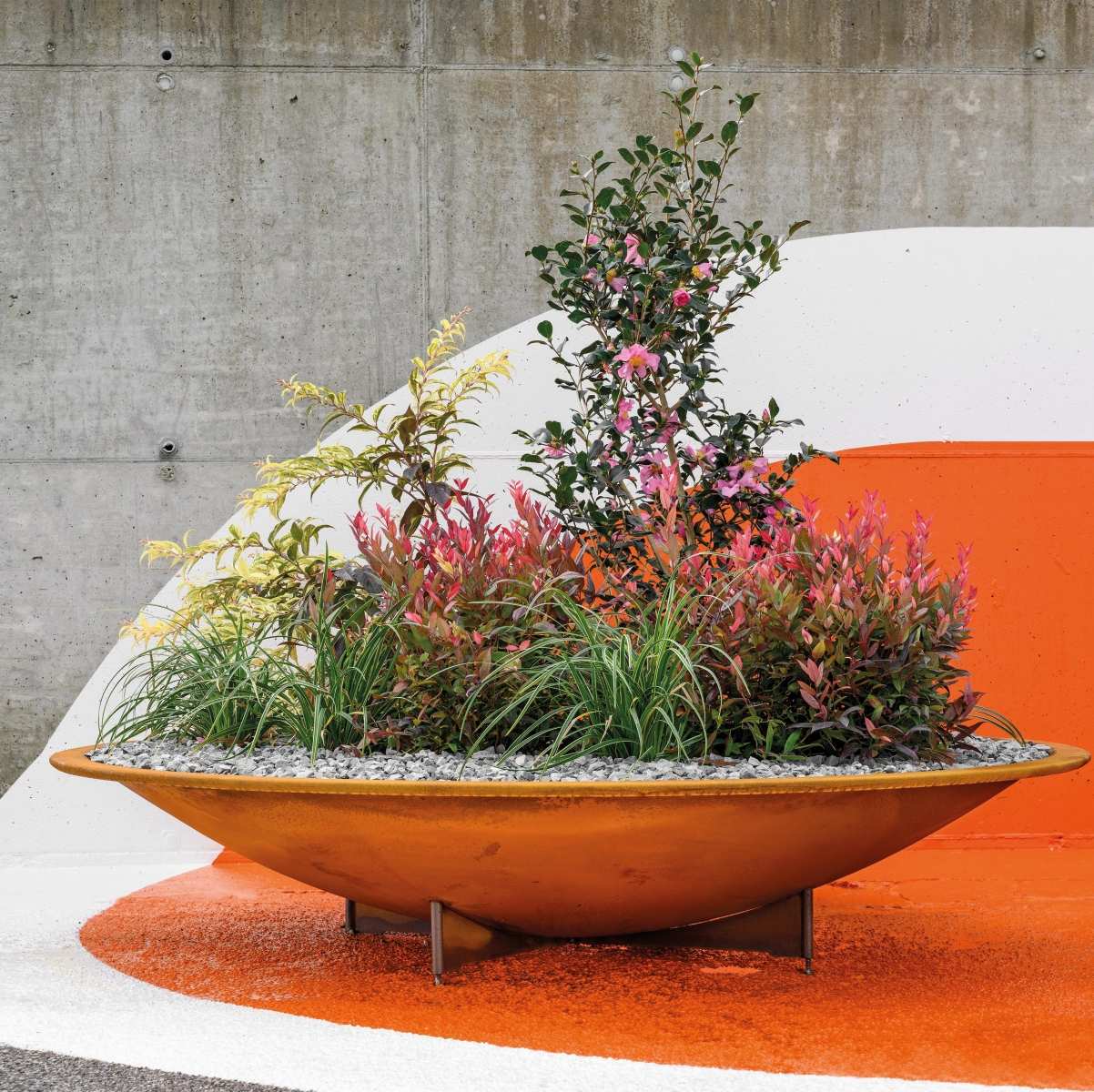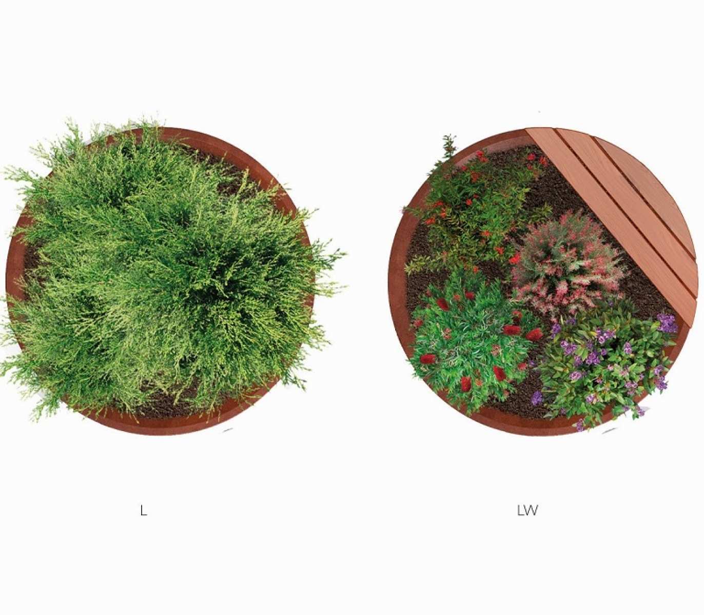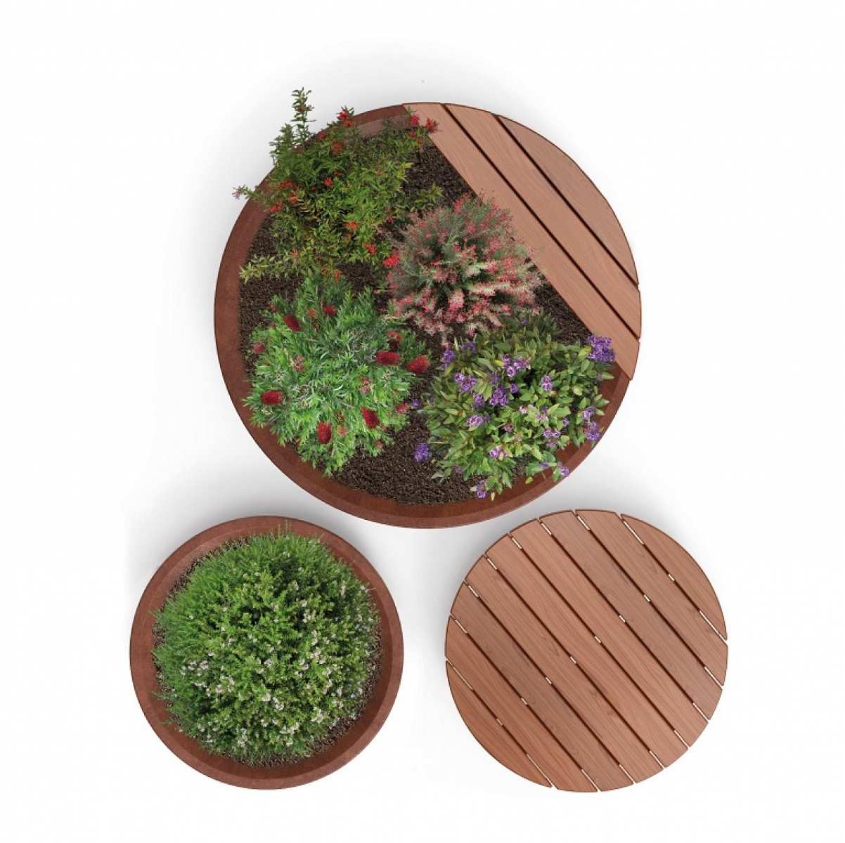 Jardiniera stradala din otel corten cu sezut din lemn exotic/lemn compozit
