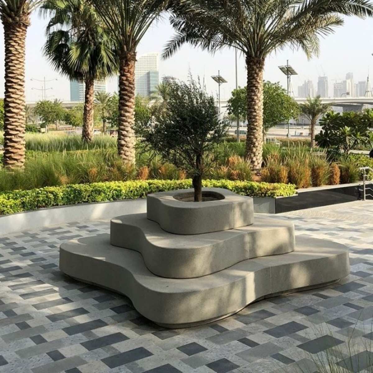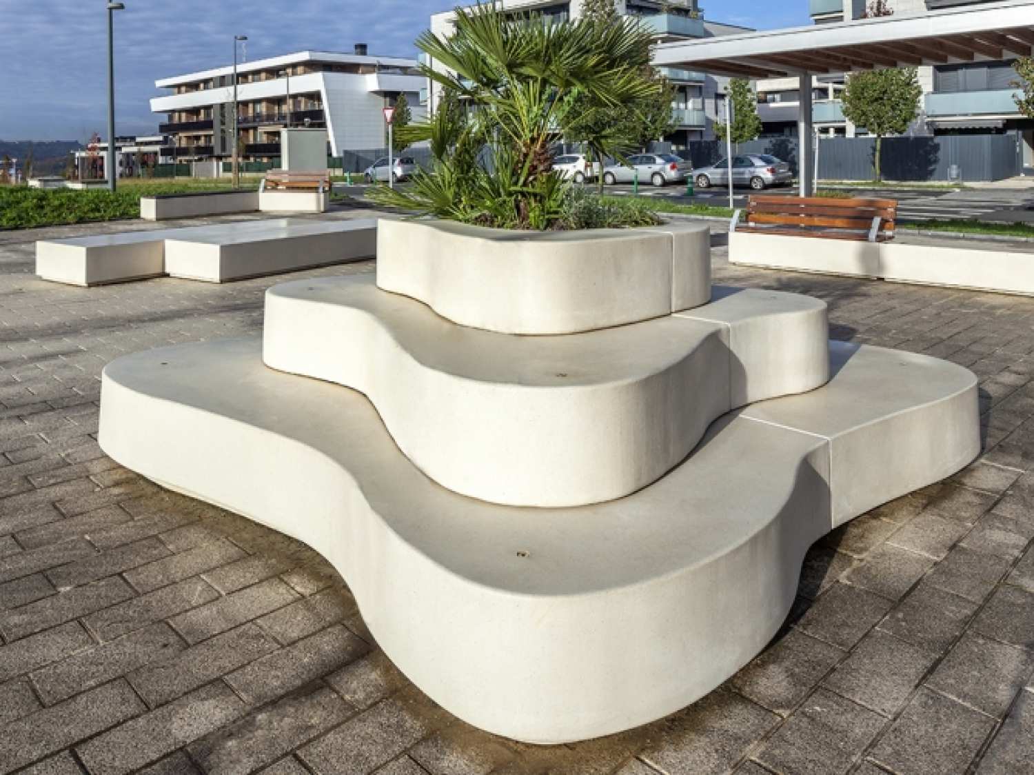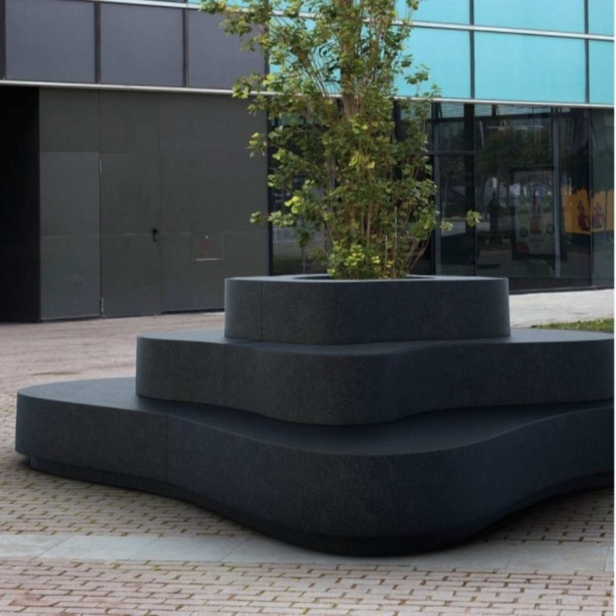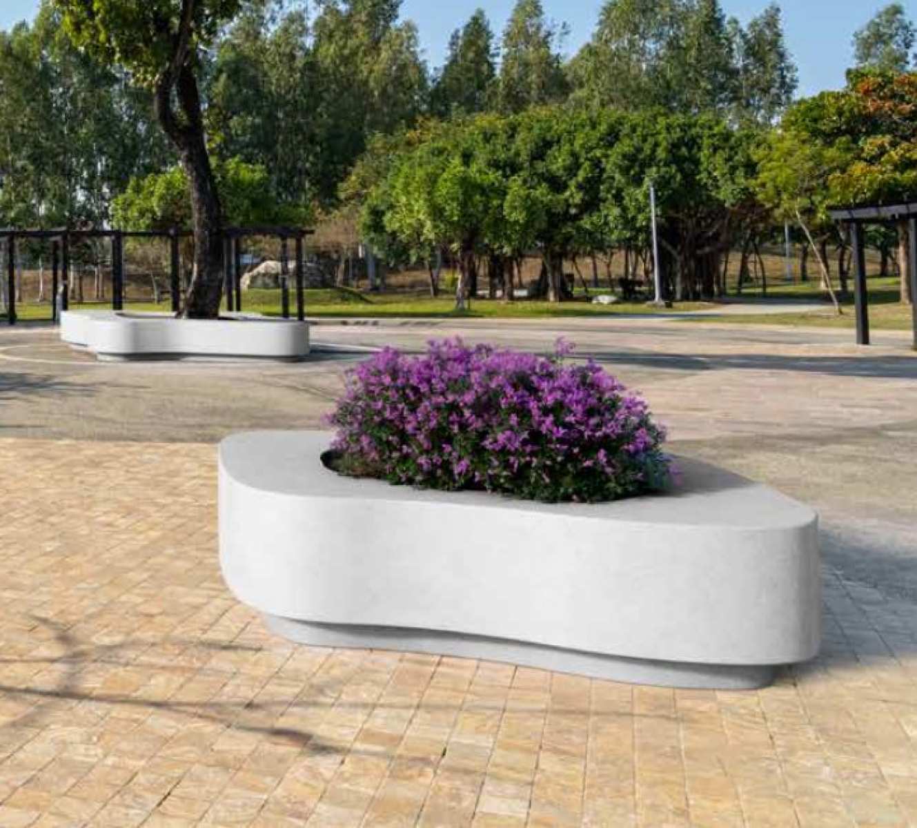 Banca-jardiniera stradala modulara tip insula din beton arhitectural model Crusöe