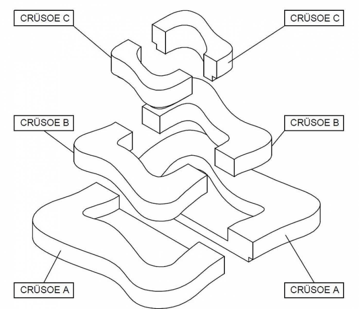 Banca-jardiniera stradala, componibila, model Crusoe, executata din beton arhitectural, poate servi ca suport tip insula pentru elemente vegetale in mijlocul orasului, ocupand spatii la diferite inaltimi.