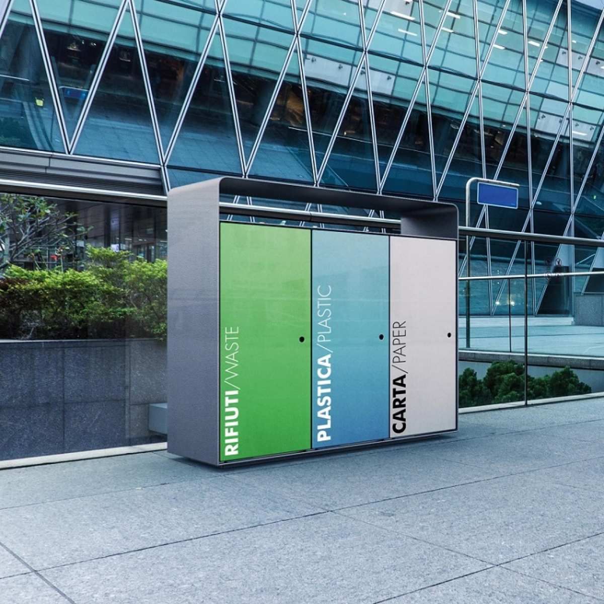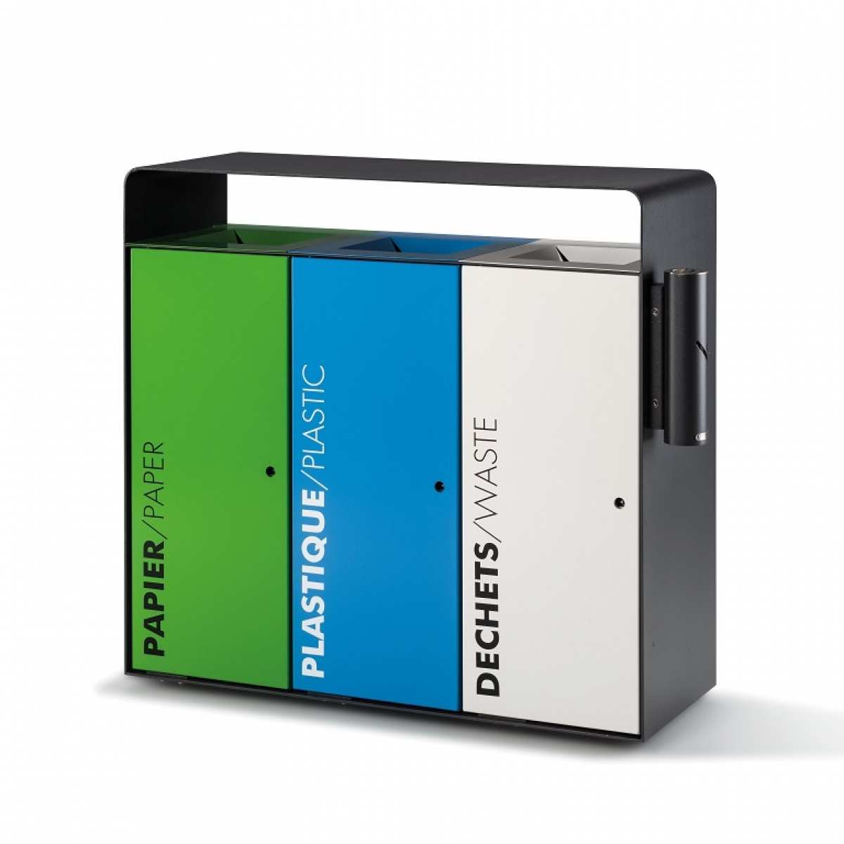 •   Cos de gunoi stradal selectiv model Bund cu 3 compartimente x 80 litri, dotat cu inel metalic intern:  L 1055 x 400 x H 1000 mm; greutate 115 kg.